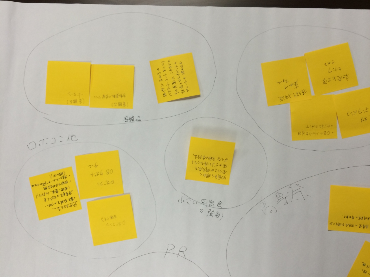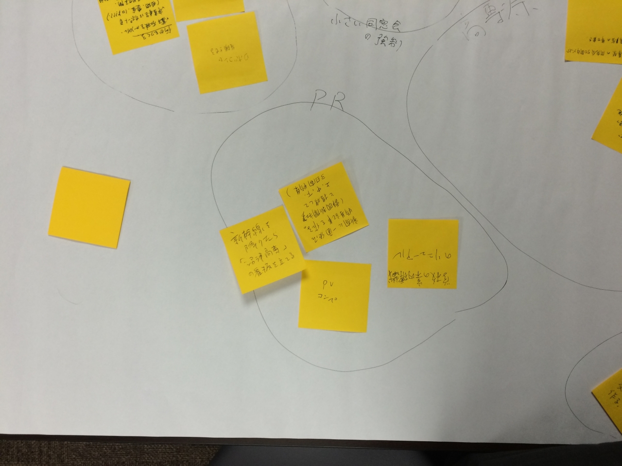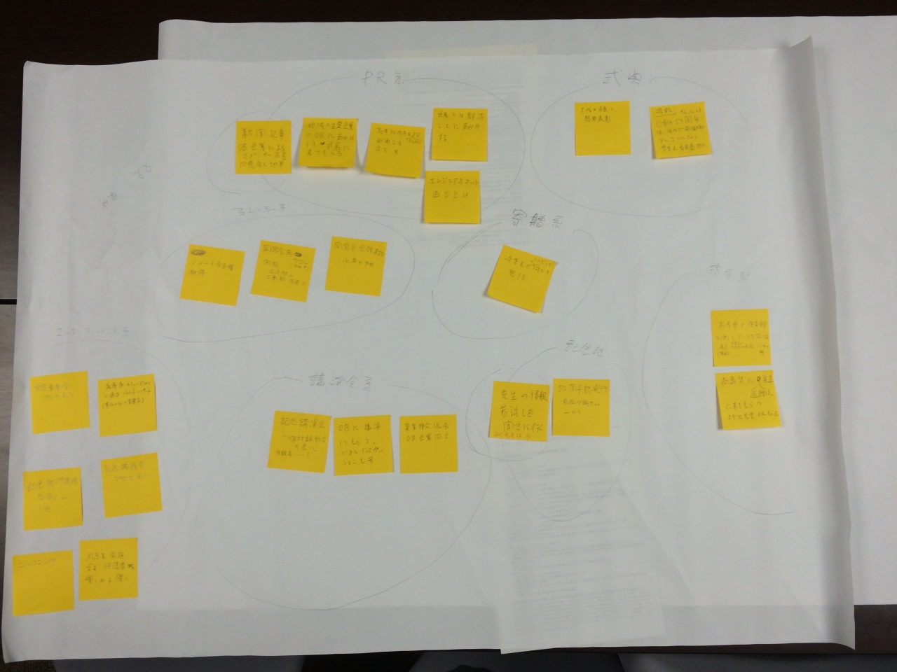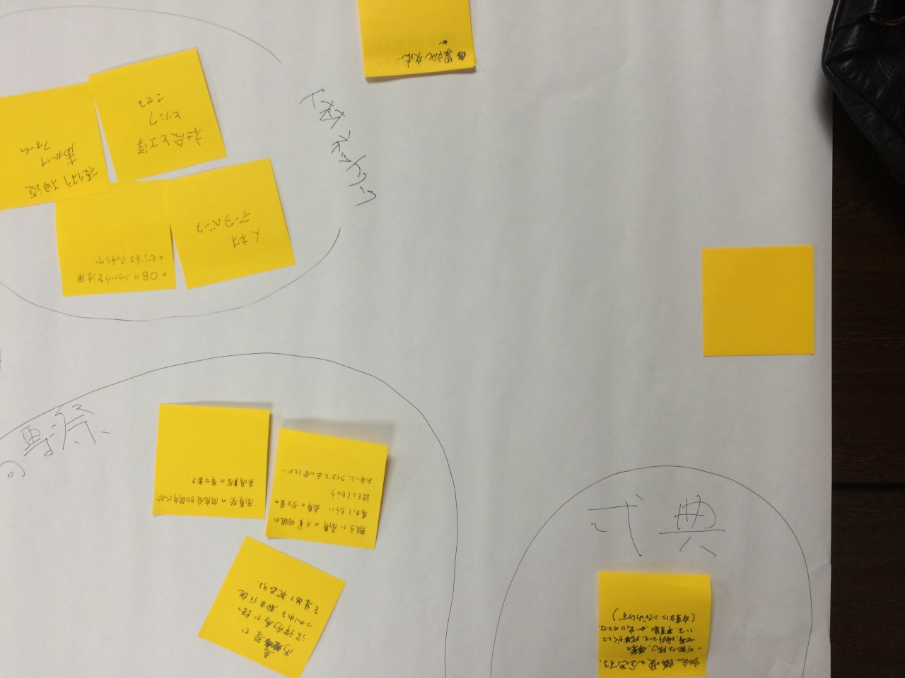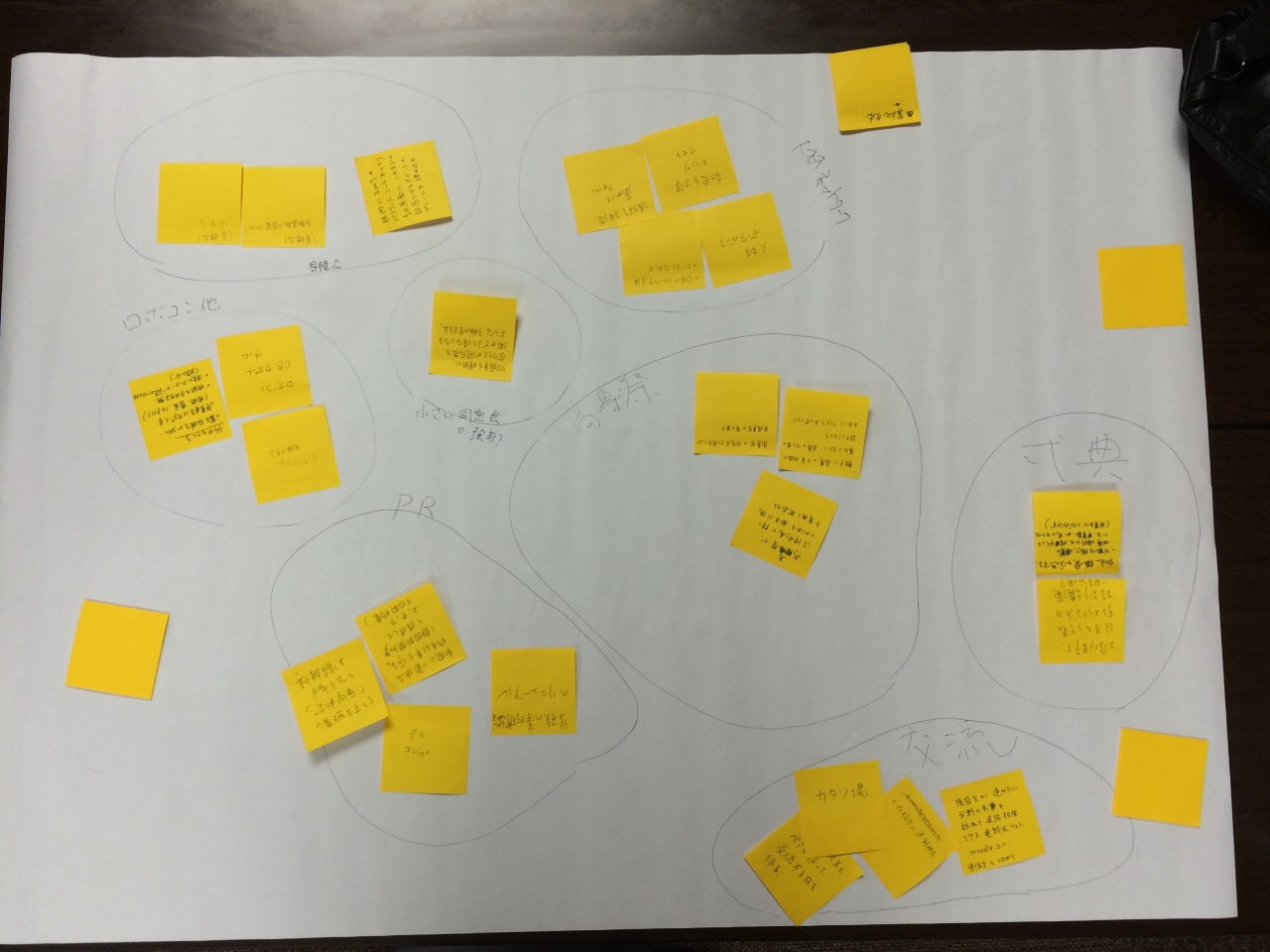 ポストイットに意見を書いて模造紙に貼るという方法で、