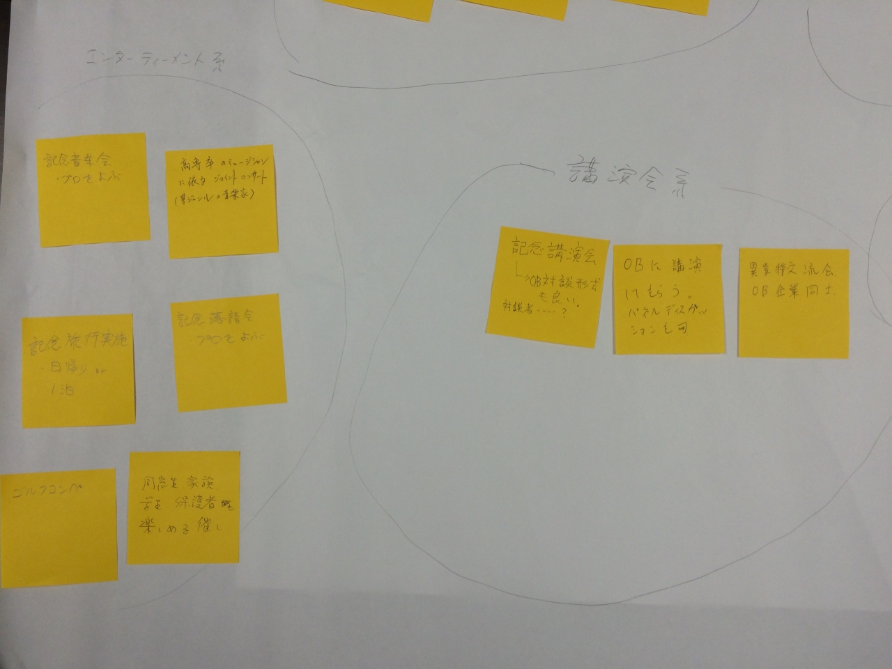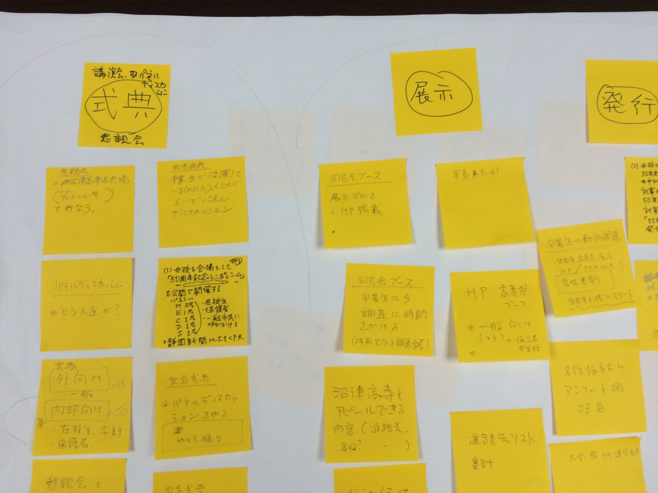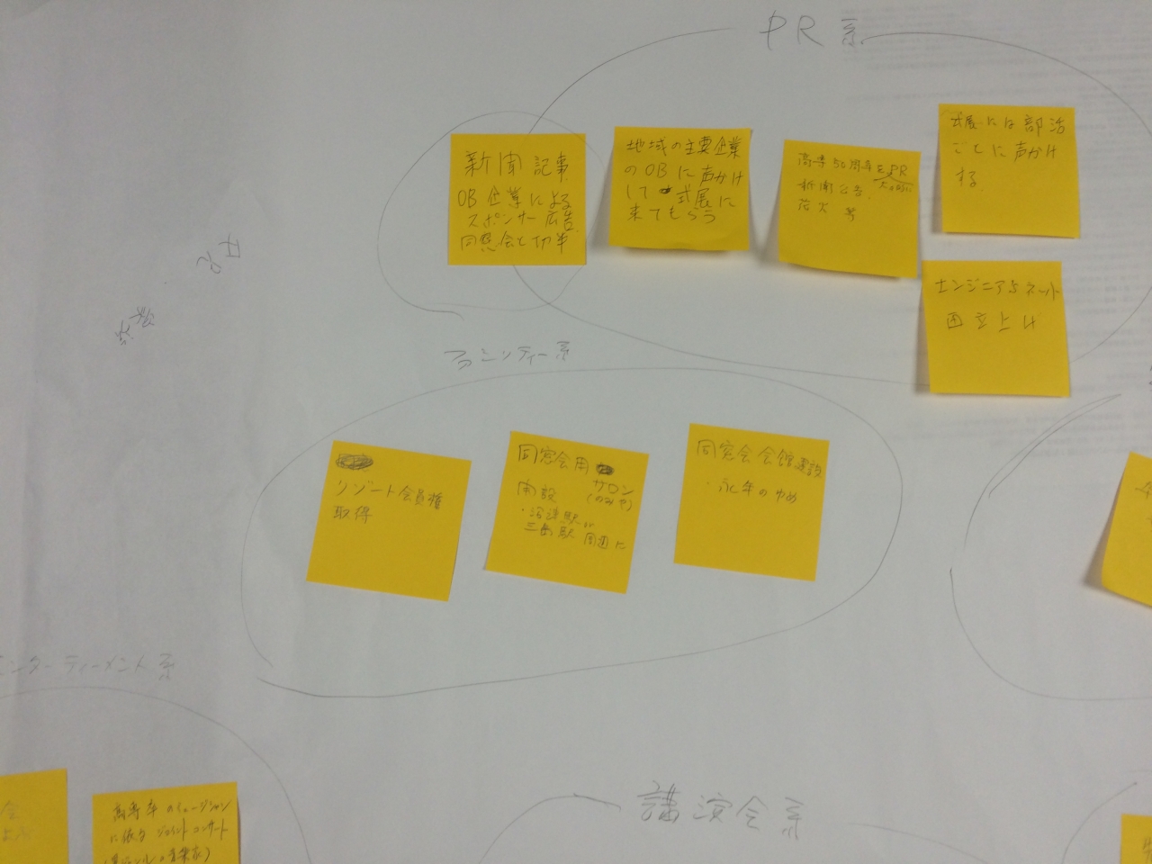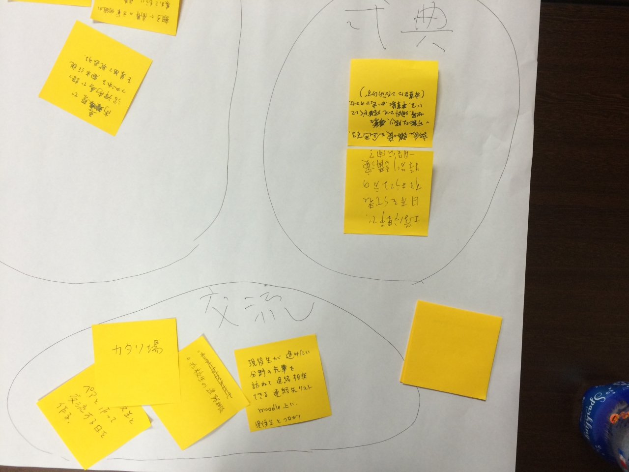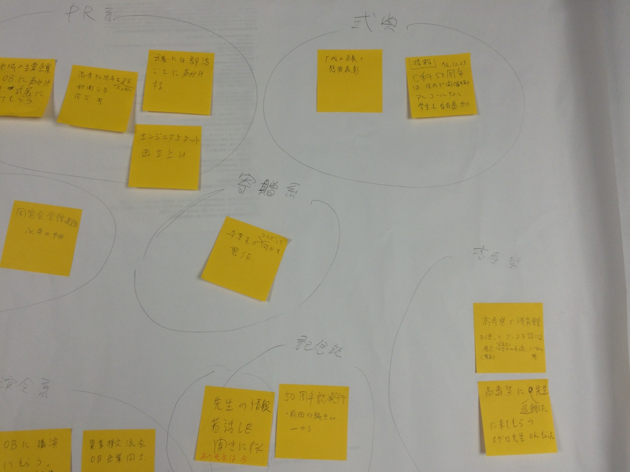 ポストイットに意見を書いて模造紙に貼るという方法で、