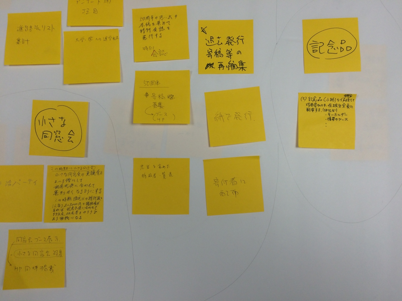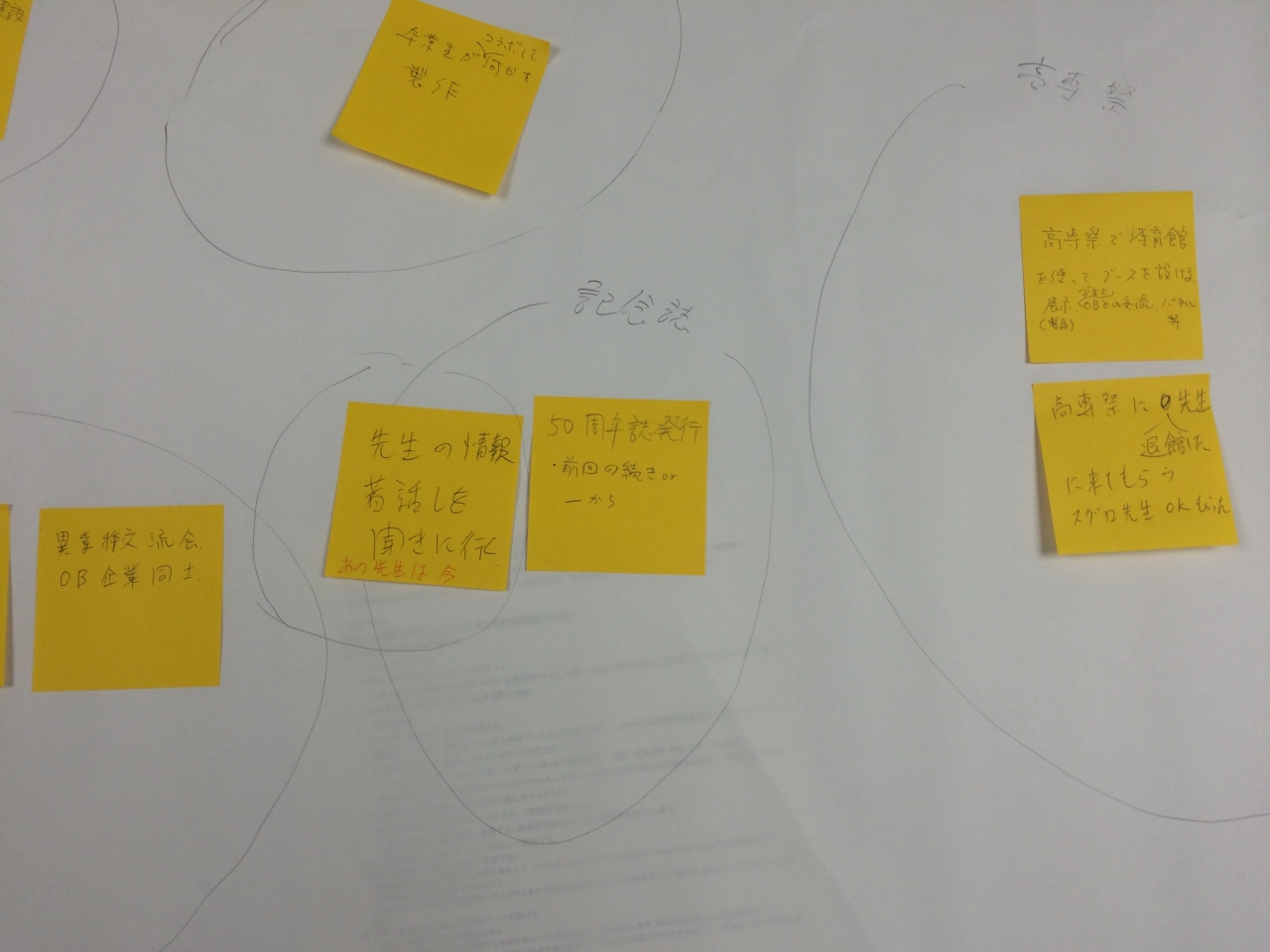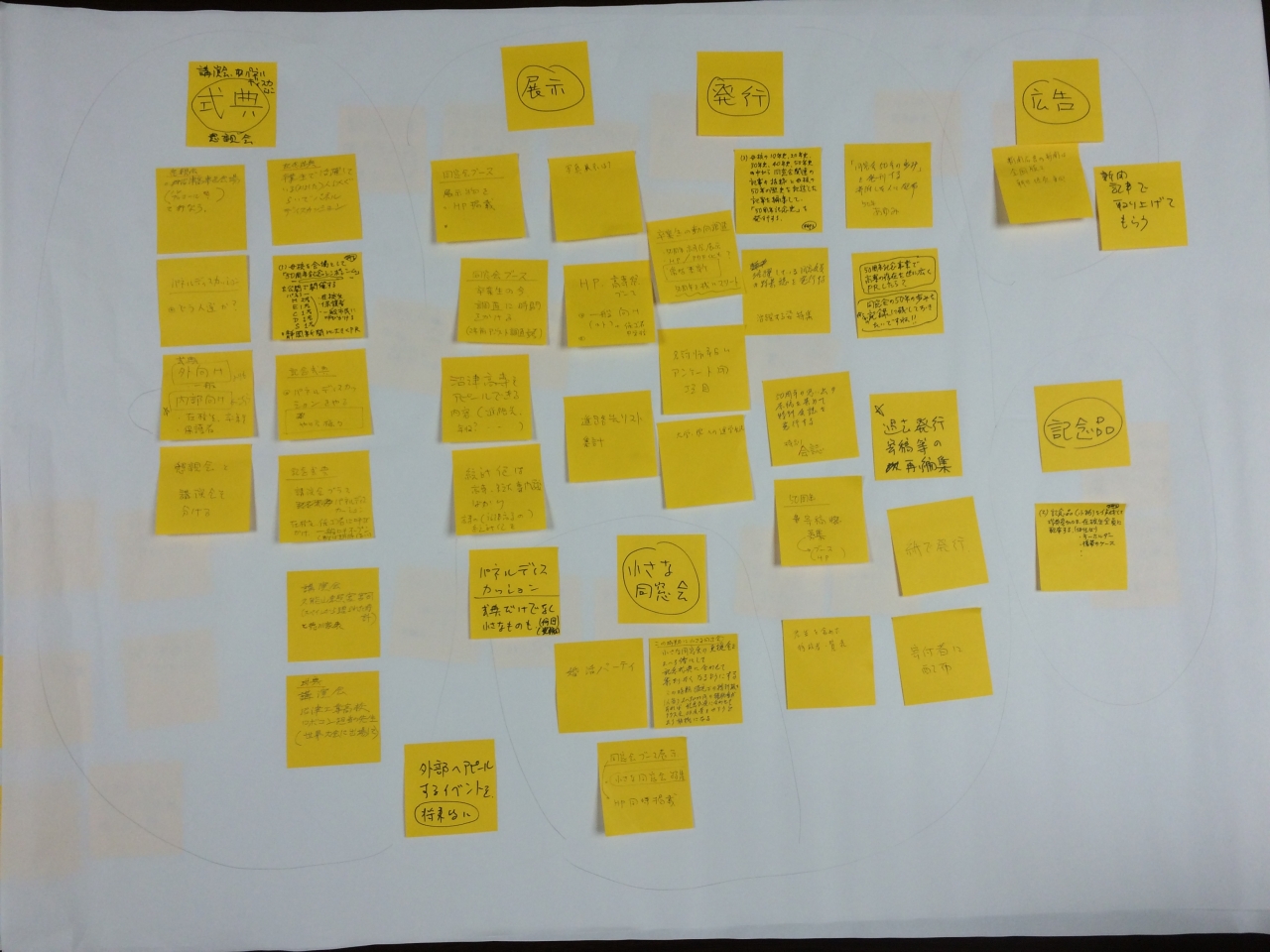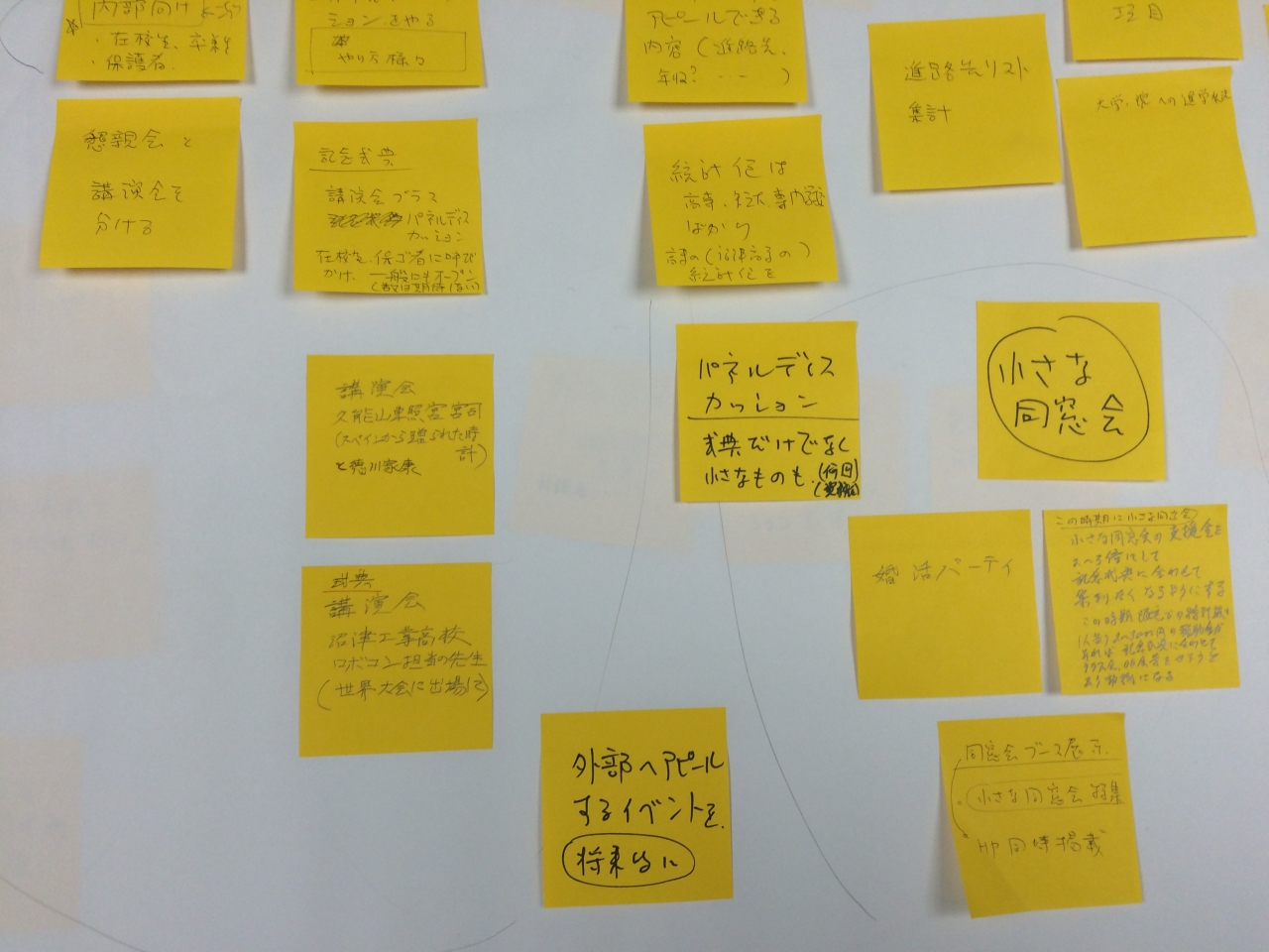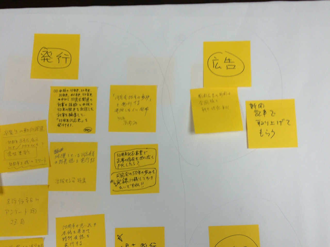 ポストイットに意見を書いて模造紙に貼るという方法で、