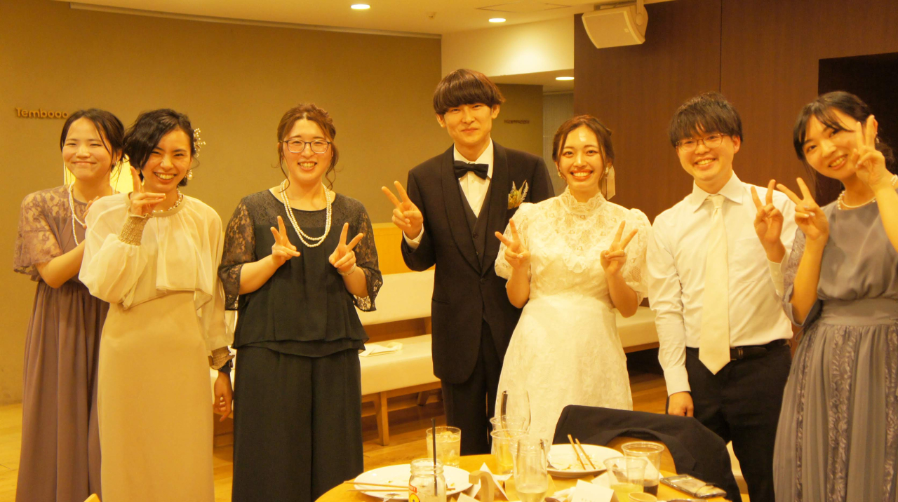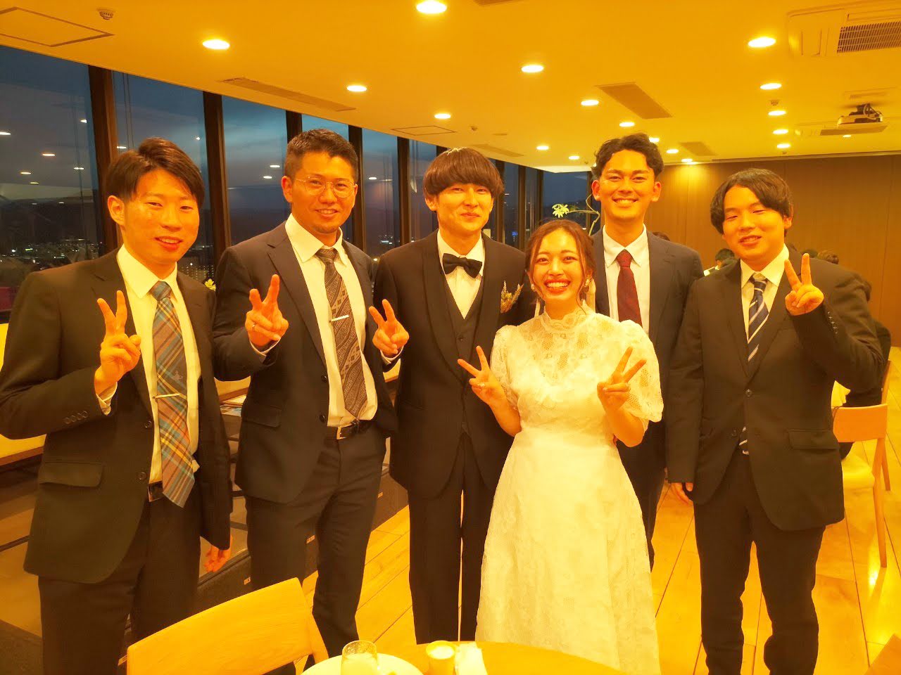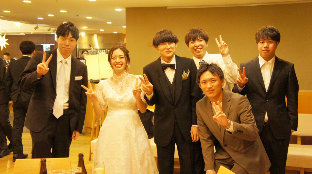 パーティーで入場のとき、入り口の方に高専の友人が座っていたのですが、皆に拍手をもらいながら迎えてもらい、思わず笑顔で手を振ってしまうほど温かい気持ちでいっぱいになりました。妻と友人達のテーブルへ回ると、皆懐かしい思い出話に話を咲かせており、私も当時を振り返りながら過ごすことができました。また、友人達も久々に合う友人同士で写真を撮ったり、パーティー内でミニゲームをして盛り上がったり、このウェディングパーティーを楽しんでいる様子でした。