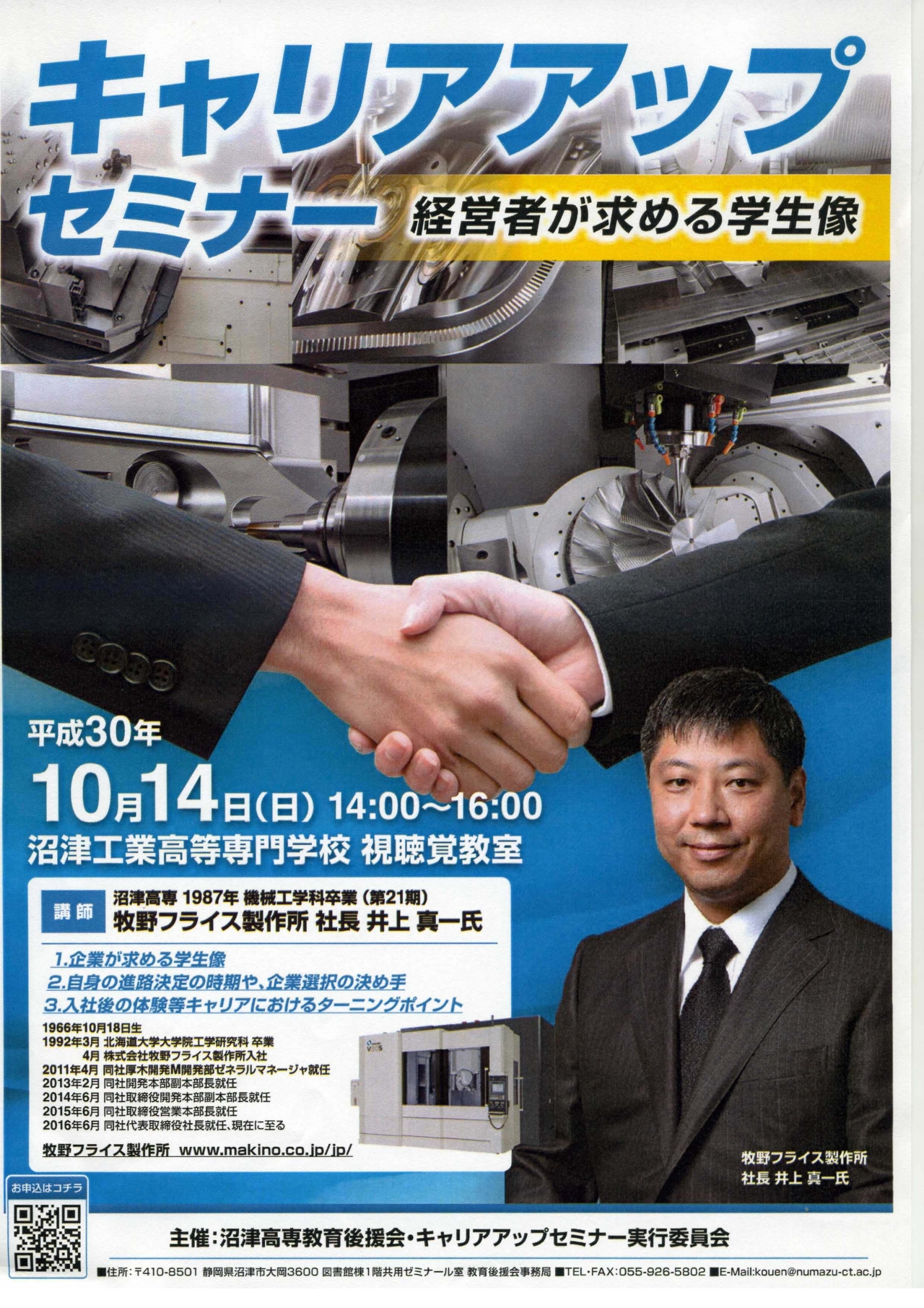 さて、この度教育後援会では沼津高専の卒業生でもあり、また工作機械トップメーカーの経営者でもある 株式会社牧野フライス製作所 社長 井上真一様をお招きしてキャリアアップセミナーを開催することになりました。